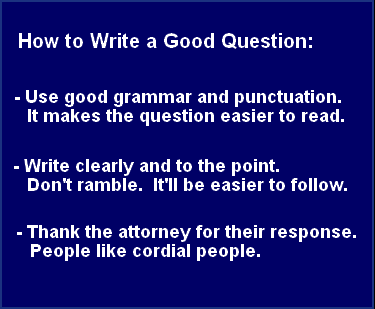 Disclaimer - The information contained in any attorney answer or response is general in nature for informational purposes only and should not be understood as a substitute for legal advice or opinion. It is recommended you consult with competent legal counsel before applying any material on this site in any particular factual situations. You are cautioned that your information will not be held confidential and no attorney-client relationship is created or construed as a result of any communication or exchange of information between you and any attorney on this site. Such a relationship is not usually established until the attorney knows that whether by doing so there is no conflict of interest and you and the attorney mutually agree on the terms of the representation. You should not send a message that contains confidential or time-sensitive information. The information provided about listed attorneys does not constitute a lawyer referral service. The attorney listings and profiles on this site are attorney advertisements.